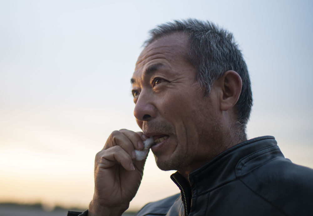 ↑雨过天晴,因担心棉花过湿而影响采收进度,陆高林急忙来到棉田摘了一朵棉花,放进嘴里咬破棉籽,看棉花被雨水淋湿的程度(10月23日摄)。