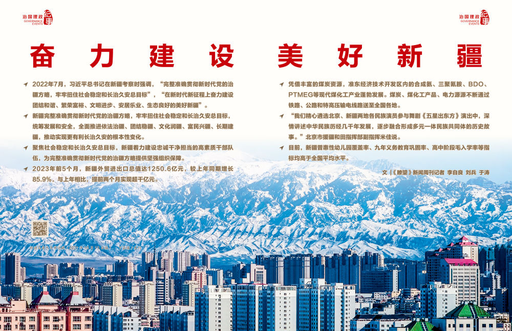 2022年7月,习近平总书记在新疆考察时强调,“完整准确贯彻新时代党的治疆方略,牢牢扭住社会稳定和长治久安总目标”,“在新时代新征程上奋力建设团结和谐、繁荣富裕、文明进步、安居乐业、生态良好的美好新疆”。