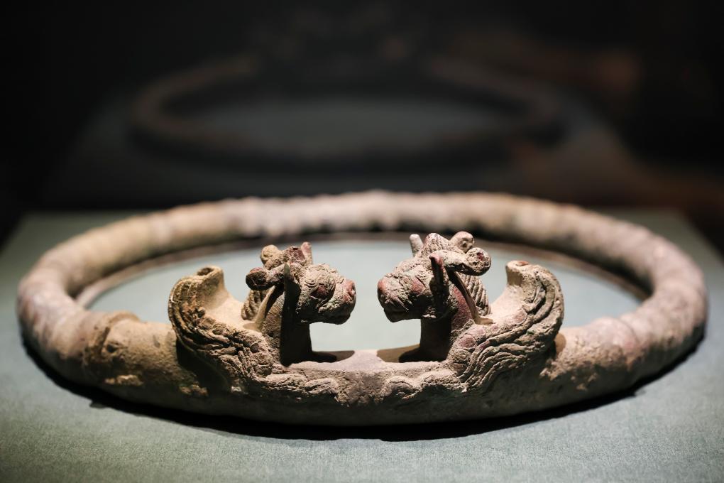 这是1月20日在展览上拍摄的战国时期的翼兽对视铜环。新华社记者 王翔 摄