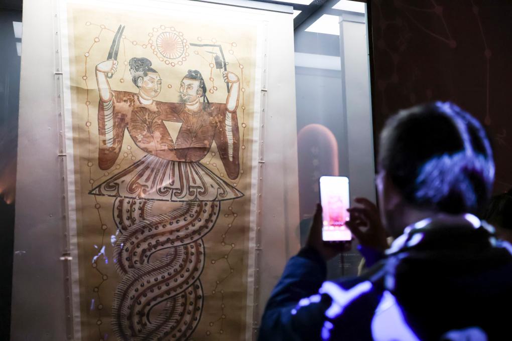 1月20日,观众在展览上拍摄唐代的彩绘伏羲女娲绢画(胡风)。新华社记者 王翔 摄