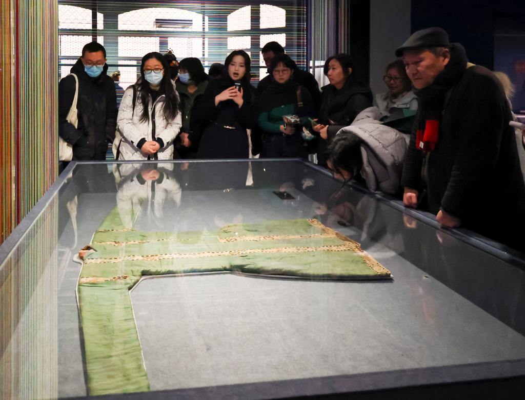 1月20日,观众在展览上观看北宋时期的缂丝饰边绿绢长袍。新华社记者 王翔 摄