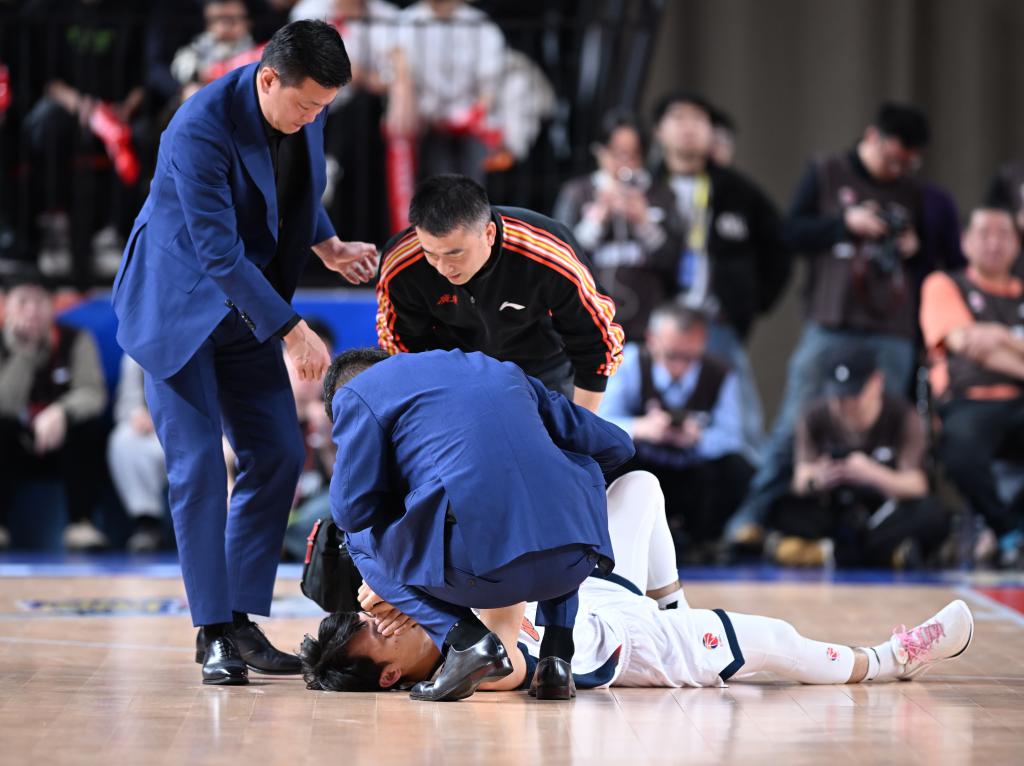 3月11日,广东东阳光队球员徐杰(下)在比赛中倒地。新华社发(徐锐摄)